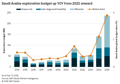 沙特阿拉伯致力于扩大采矿业的决心从勘探预算的逐年大幅增长中可见一斑。2022年以来,采矿勘探预算飙升595%,从2022年的2100万美元增至2025年的1.46亿美元。这一增长得益于持续的地质勘测、技术进步和更高的勘探预算,所有这些都表明沙特阿拉伯因其稳定性和发展机遇而吸引了大量外国投资。尽管增长显著,但与澳大利亚和加拿大等成熟的矿业管辖区相比,沙特阿拉伯的勘探支出仍然相对较少,这些矿业发达国家通常每年投入超过10亿美元。