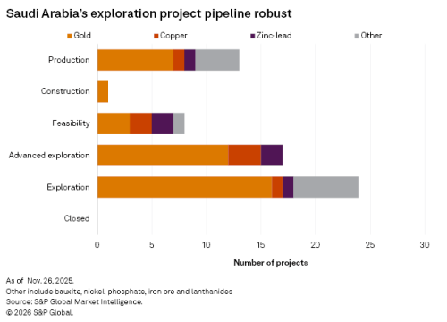 不同矿产的勘探预算分配发生了显著变化,反映沙特阿拉伯不断变化的优先事项和市场动态。自2022年以来,黄金的勘探预算分配份额大幅上升,2025年占总预算的约72%。这凸显了黄金作为行业增长、吸引外资和促进经济多元化驱动力的重要性。2025年铜的勘探预算占比达23%,体现出全球对铜的需求日益增长,尤其是在能源转型和基础设施建设方面。通过优先发展黄金和铜,沙特阿拉伯正努力把握未来的市场机遇,推动长期增长。其他矿物,如白银、钾肥和镧系元素,仍然吸引着投资,但由于前景更可观的新矿藏的发现以及沙特对国际市场趋势的战略性应对,它们的相对份额有所下降。沙特阿拉伯的目标是跻身全球铜和黄金生产国前20强。